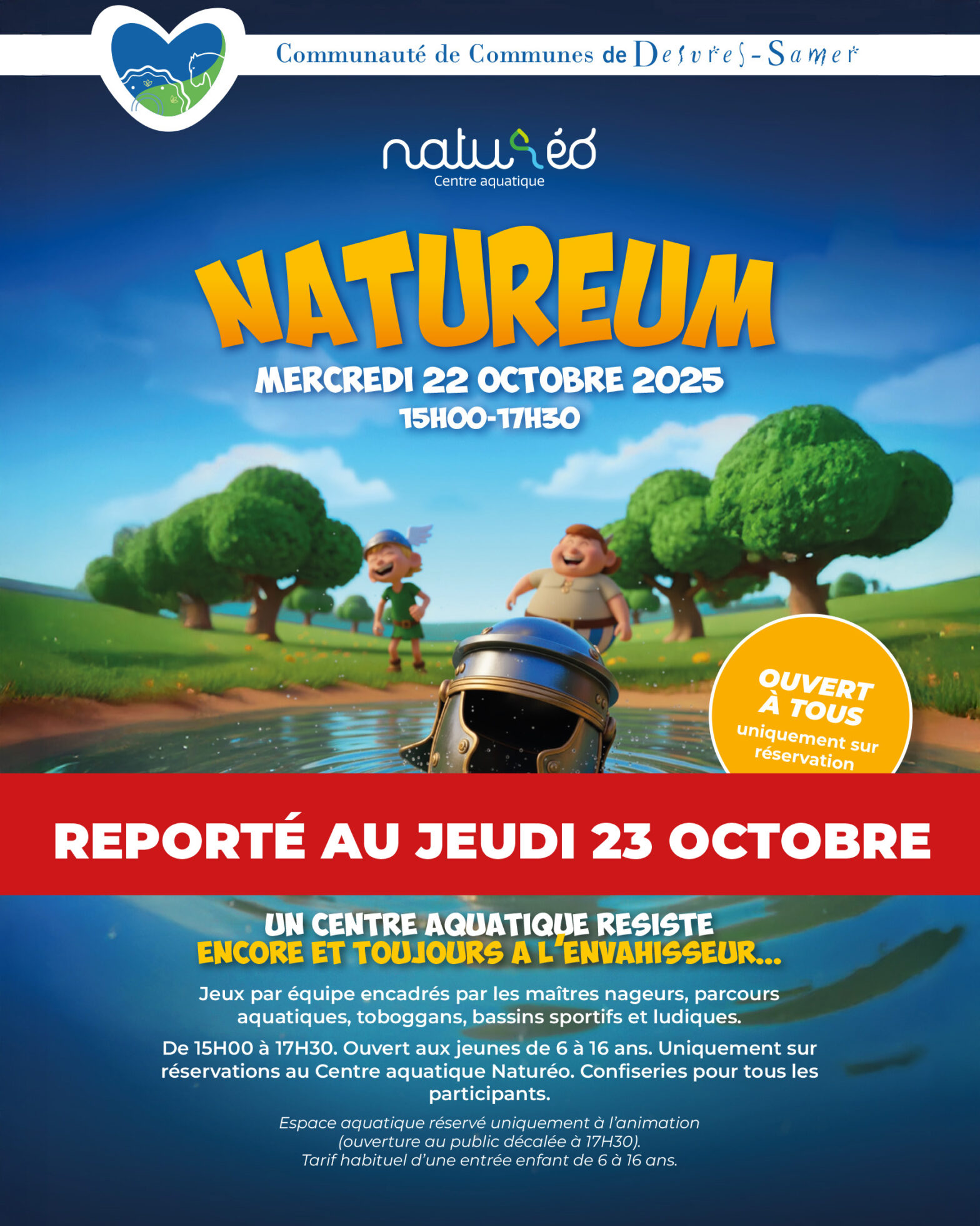 Ouvert aux jeunes de 6 à 16 ans. Uniquement sur réservations au Centre aquatique Naturéo. Confiseries pour tous les participants. Tarif habituel d’une entrée enfant de 6 à 16 ans.