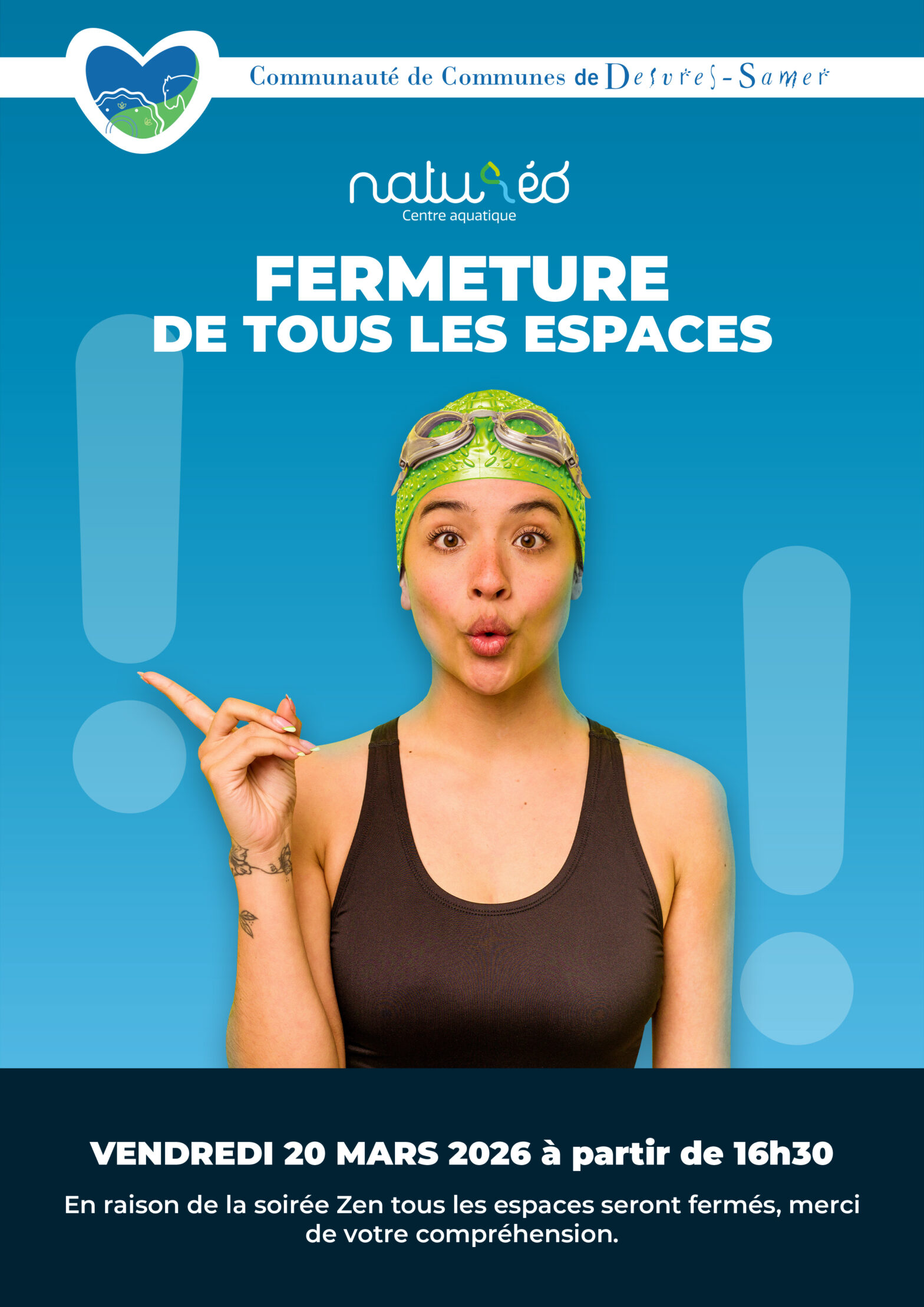 Le centre aquatique Naturéo informe ses usagers qu’une fermeture exceptionnelle de l’ensemble des espaces interviendra le vendredi 20 mars 2026 à partir de 16h30.